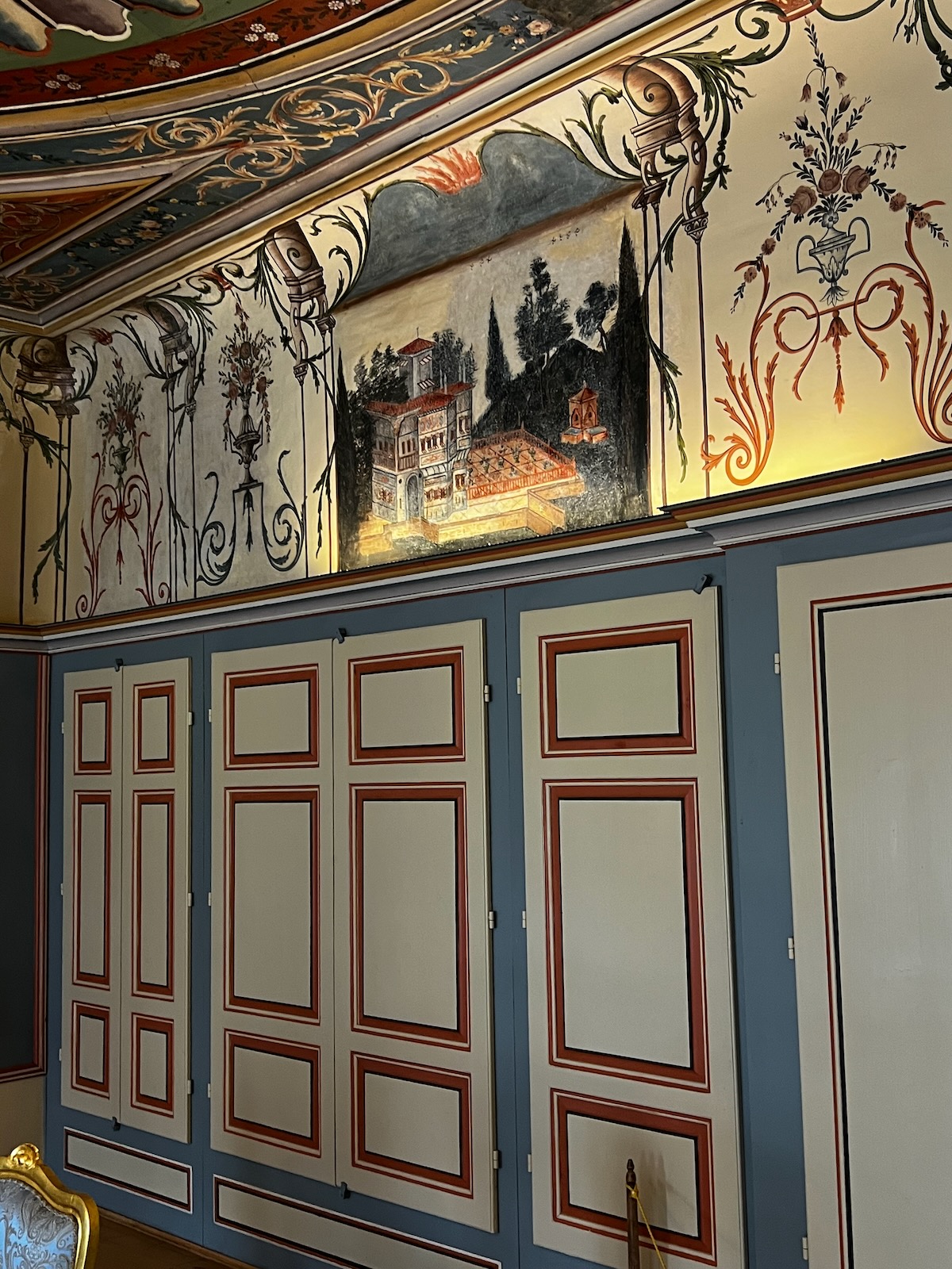 Duvar süslemeleri karmaşık geometrik, mimari ve çiçek motifleri ve manzaralarla dolu. Bazıları Saint Petersburg, Stockholm, Lizbon, Atina, Venedik, İskenderiye ve İstanbul manzaralarını tasvir ediyor.