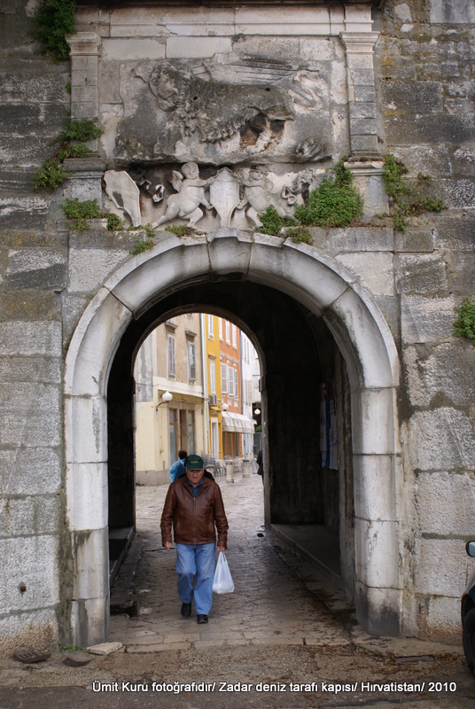 Deniz kapısı, eski bir Roma kapısı üzerine, 1573 yılında Michele Sanmicheli tarafından yeniden yapım olan bir kapı. Kapının dışında üstte Venedik Krallığının simgesi olan St Mark Aslanı ve altında da 1571 yılında kazanılan Leponto savaşı anısına yapılan kabartma varken, arka tarafında 1177 yılında şehri ziyaret eden Papa Alexander III anısına kabartma mevcut. Kapının içinden geçtikten sonra karşımıza çıkan evin yan duvarı savaştan kalma kurşun izleri ile dolu. Çok daha dramatik örneklerini Bosna Hersek topraklarında göreceğimizi bilmeden “savaşta çok çekmişler” diye düşündük. Ama Bosna da gördüklerimiz karşısında bu duvar hafif bir örnekmiş. Gerçi savaşın azı çoğu değil, hepsi kötü.