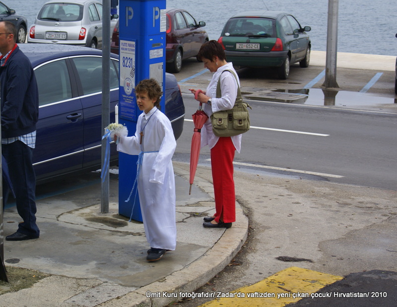 Eski Zadar şehri bir yarımada üzerine kurulu. İki kapısı mevcut. Otobüsümüz Zadar’a varınca rehberle deniz tarafındaki kapıda buluştuk. Otobüste bekleme yaparken bir küçük delikanlının beyaz bir papaz giysisi ve elinde bir muma benzer obje ile anne ve babasının yanında durduğunu gördük. Meğerse çocuğun ilk vaftiz töreni sonrası hali buymuş.