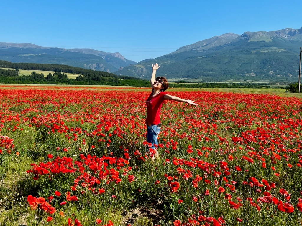 Kazanlık yolu, 2 gündür gezdiğimiz boş yollara göre oldukça kalabalık. Sanki herkes Kazanlık’a festivale akın ediyor. Yol üzerinde bir gelincik tarlası görünce, ilk molamızı yolda gördüğümüz bu gelincik tarlasında verdik.