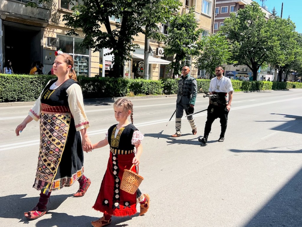 Sonunda mikrofonların olduğu bir yere ulaştık. Yürüyüş buradan başlıyor ve Seuthopolis Meydanı‘na kadar gidiyor. İlerideki yerlerin, festival komitesince satılan ücretli yerler olduğunu düşünüp, festival kortejinin protokolü selamlayacağı yerde durmaktansa, yürüyüşün başlangıcında olayı izlemeye karar verdik.